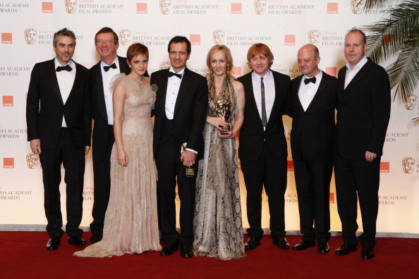 Harry Potter at the 2011 BAFTAs. (Left to Right) Alfonso Cuarón, Mike Newell, Emma Watson, David Heyman, J. K. Rowling, Rupert Grint, David Barron and David Yates