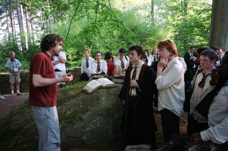The cast on the Prisoner of Azkaban set with the director Alfonso Cuarón