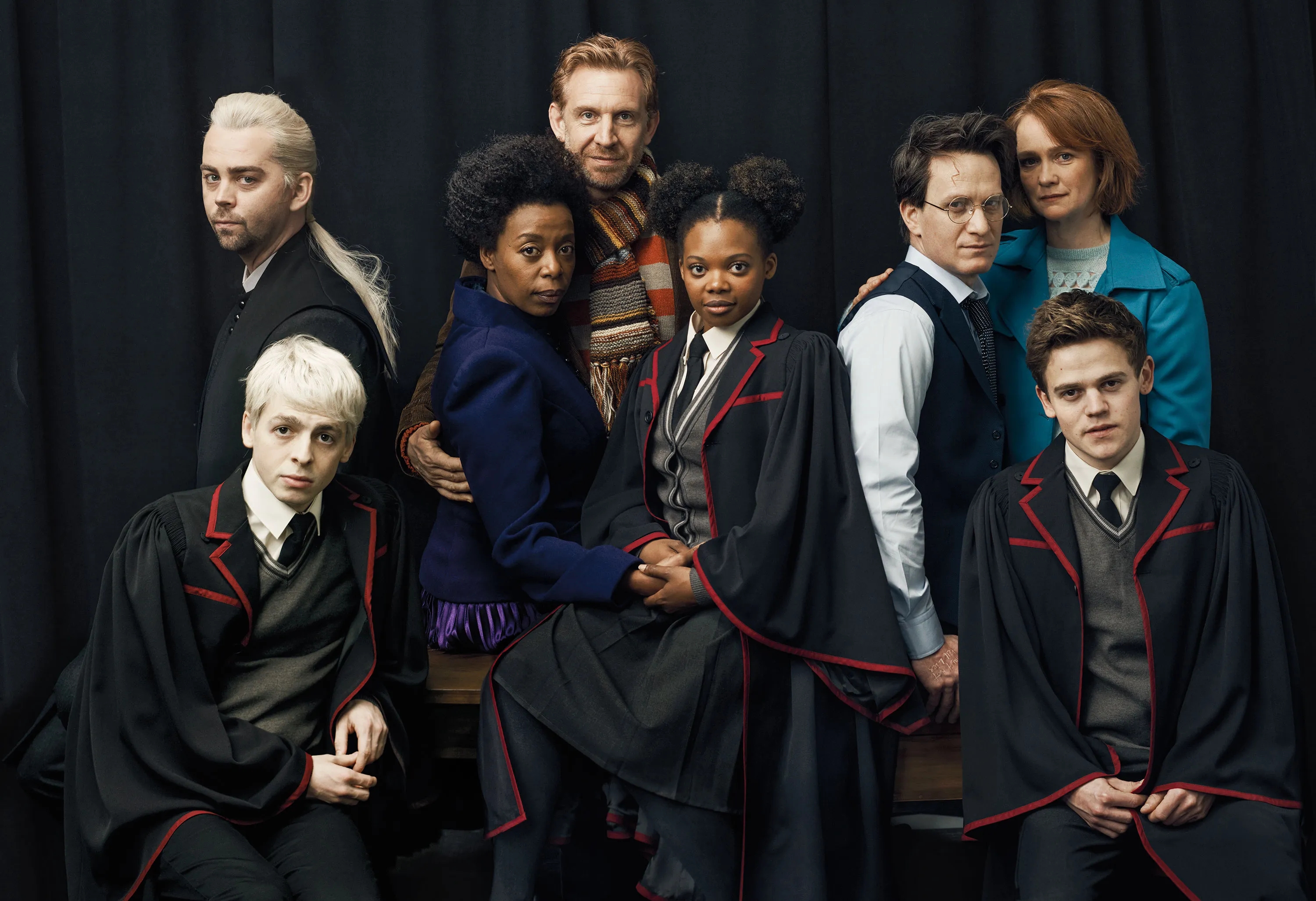 (L-R): Paul Thornley (Ron Weasley), Noma Dumezweni (Hermione Granger), Jamie Parker (Harry Potter), Sam Clemmett (Albus Potter), Poppy Miller (Ginny Potter), Alex Price (Draco Malfoy) and Anthony Boyle (Scorpius Malfoy)