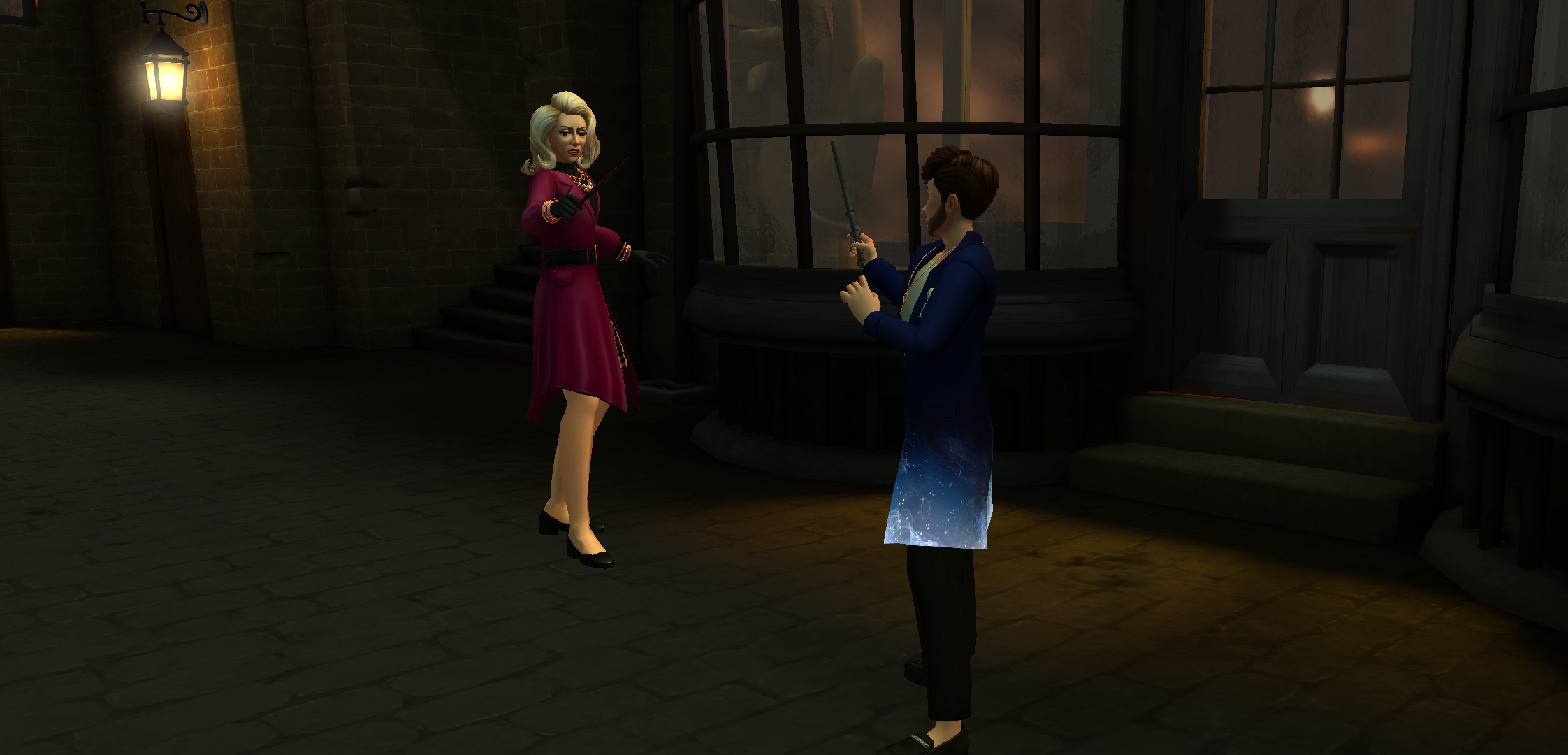 Jacob's sibling arrived at the courtyard and saw Merula scolding Ben in front of the public, so they started a duel with her. When the duel reached an end, Professors Snape and Flitwick arrived. Snape instructed both Merula and Jacob's sibling to arrive in the West Tower to receive their punishment.[61]