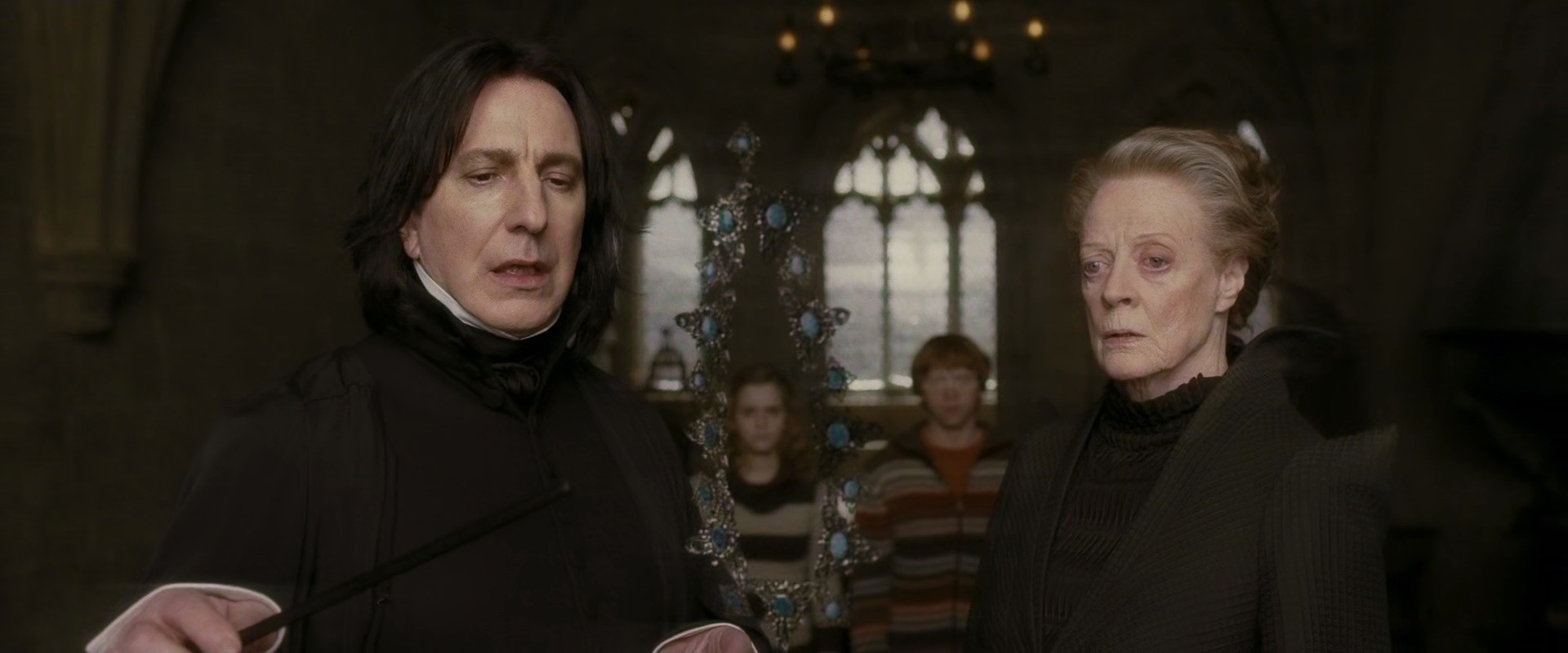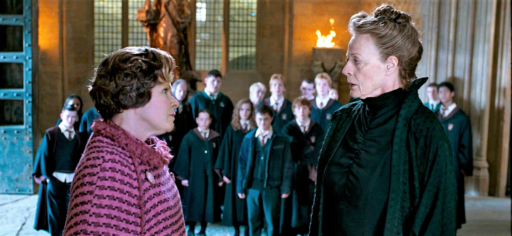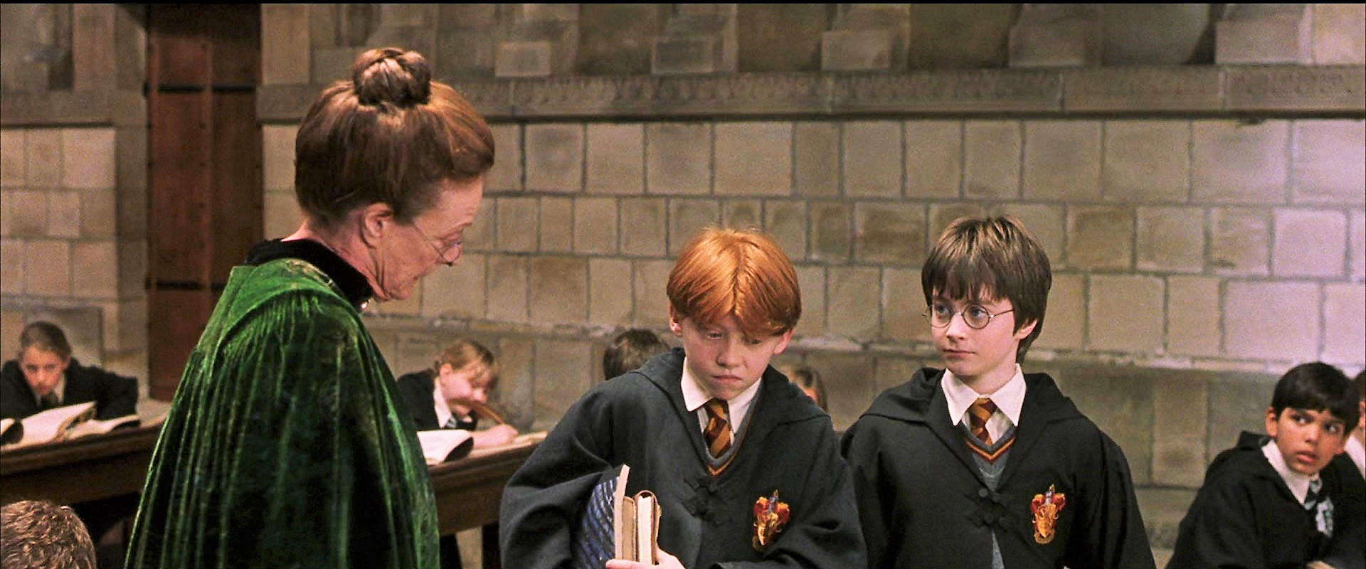 McGonagall chastising Harry and Ron for being late to class