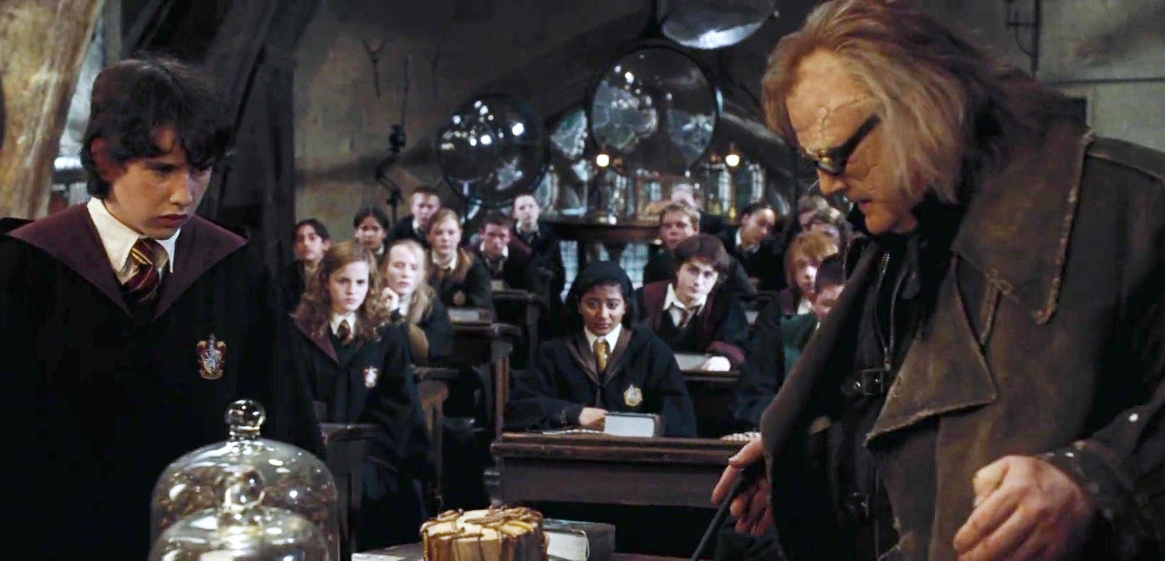 In "Mad-Eye" Moody's first Defence Against the Dark Arts class, Neville was able to supply information about the Unforgivable Curses, in particular the Cruciatus Curse. When Professor Moody demonstrated the curse on a spider, Neville was terrified; he gripped his desk so hard, his knuckles turned white. Hermione noticed this and called for the professor to stop. After class, Moody — who was in fact Barty Crouch Jnr, one of the attackers of Neville's parents, under disguise by use of Polyjuice Potion — took Neville to his office for a cup of tea.