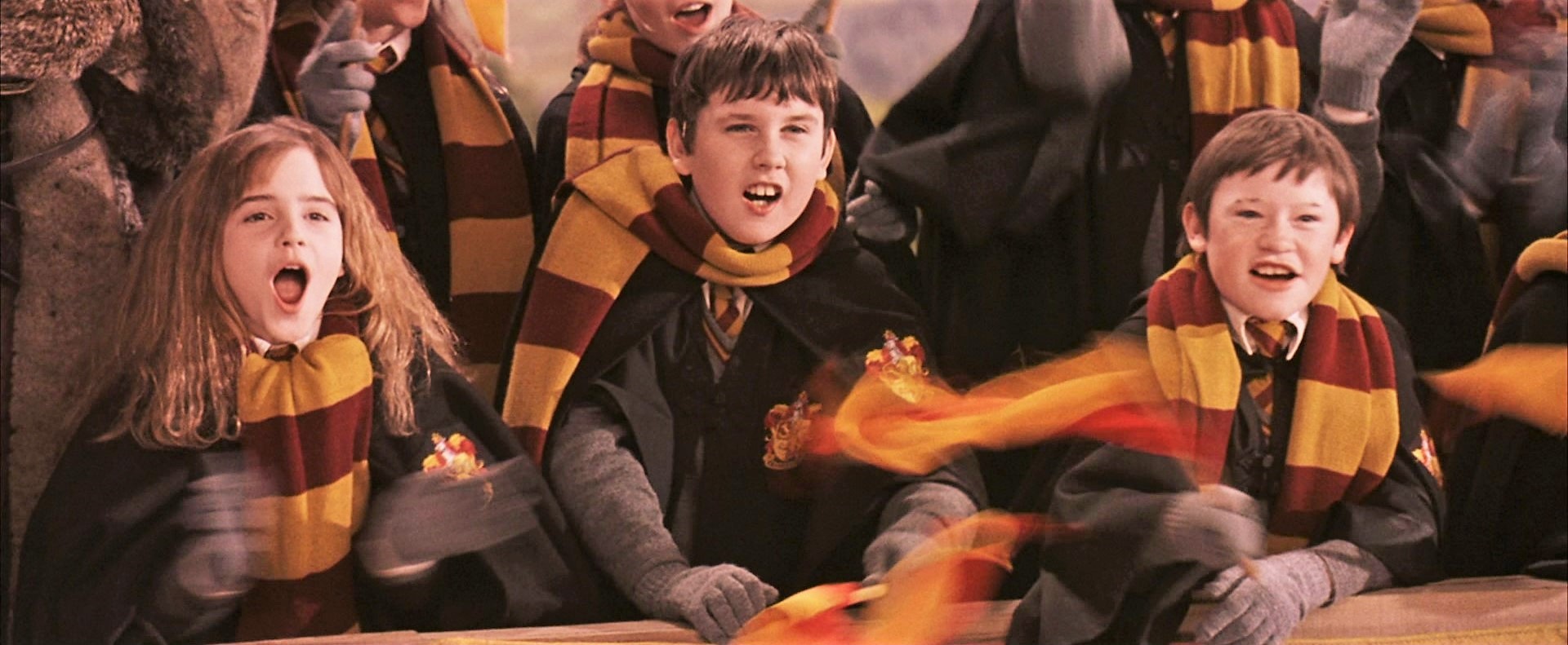 Neville cheering on the Gryffindor Quidditch Team during a match