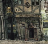 Diagon Alley was accessible from Muggle London through the Leaky Cauldron, which was on Charing Cross Road, set between a bookshop and a record shop. The Muggles who passed by the inn seem to be "quite unconscious" of its existence.[1] Knockturn Alley was an off shoot of Diagon Alley,[5] as were the areas of Horizont Alley and Carkitt Market.